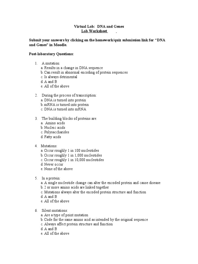 This virtual lab allows students to run experiments where they can change variables, like population size, migration rate, mutation rate, and fitness of two separate alleles. Applying worksheets means facilitating pupils to manage to answer issues about topics they've learned. Open the virtual lab entitled dna and genes. If you come upon terms that are unfamiliar to you, please refer to your textbook for further explanation or search the word here: Frameshift, meaning the reading frame changes, changing the amino acid sequence.